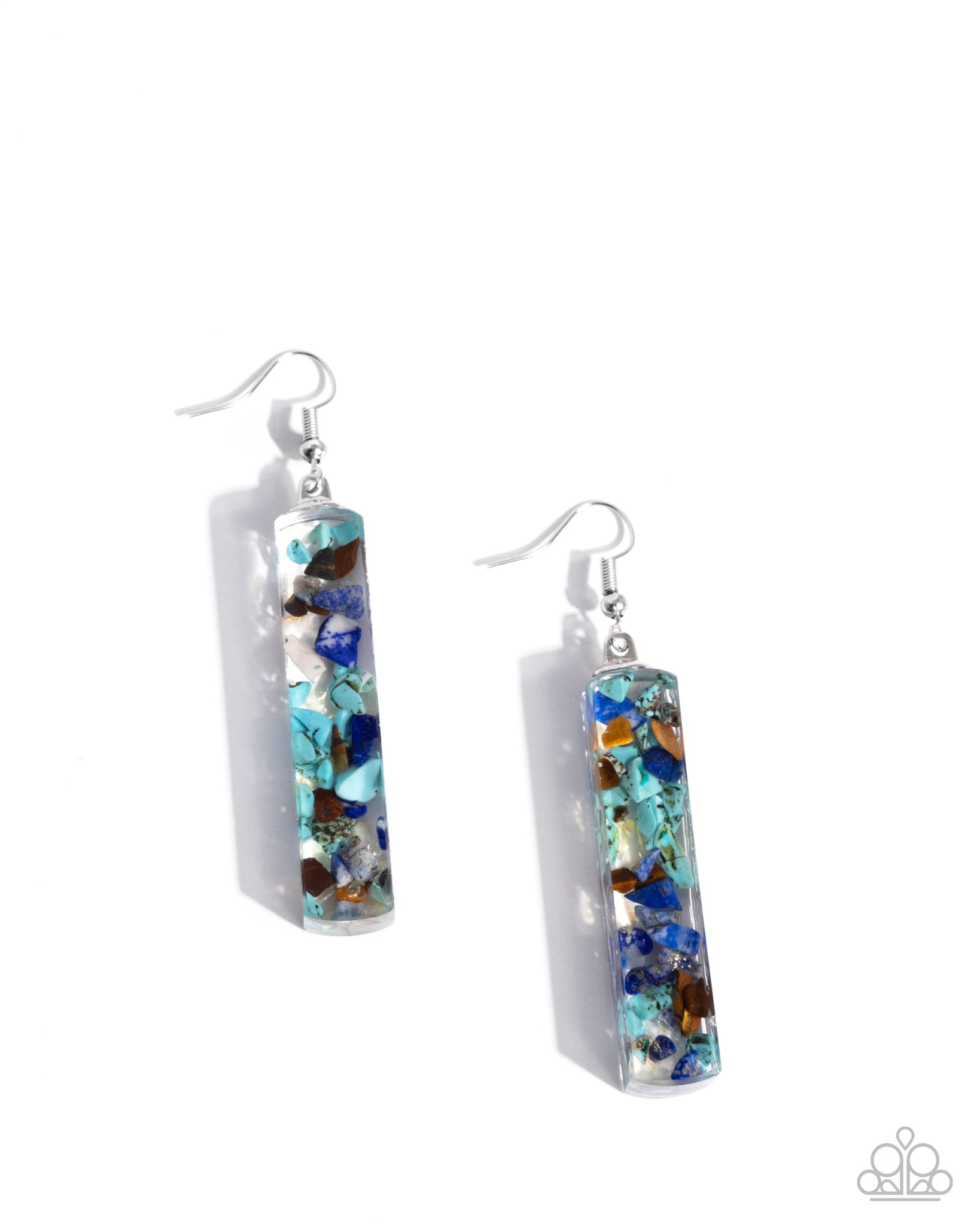 Rectangular clear acrylic bars feature a colorful mix of embedded stone accents in shades of turquoise, blue, and Tiger's Eye. The vibrant hues create a natural and earthy appeal. Earring attaches to a standard fishhook fitting. As the stone elements in this piece are natural, some color variation is normal.
