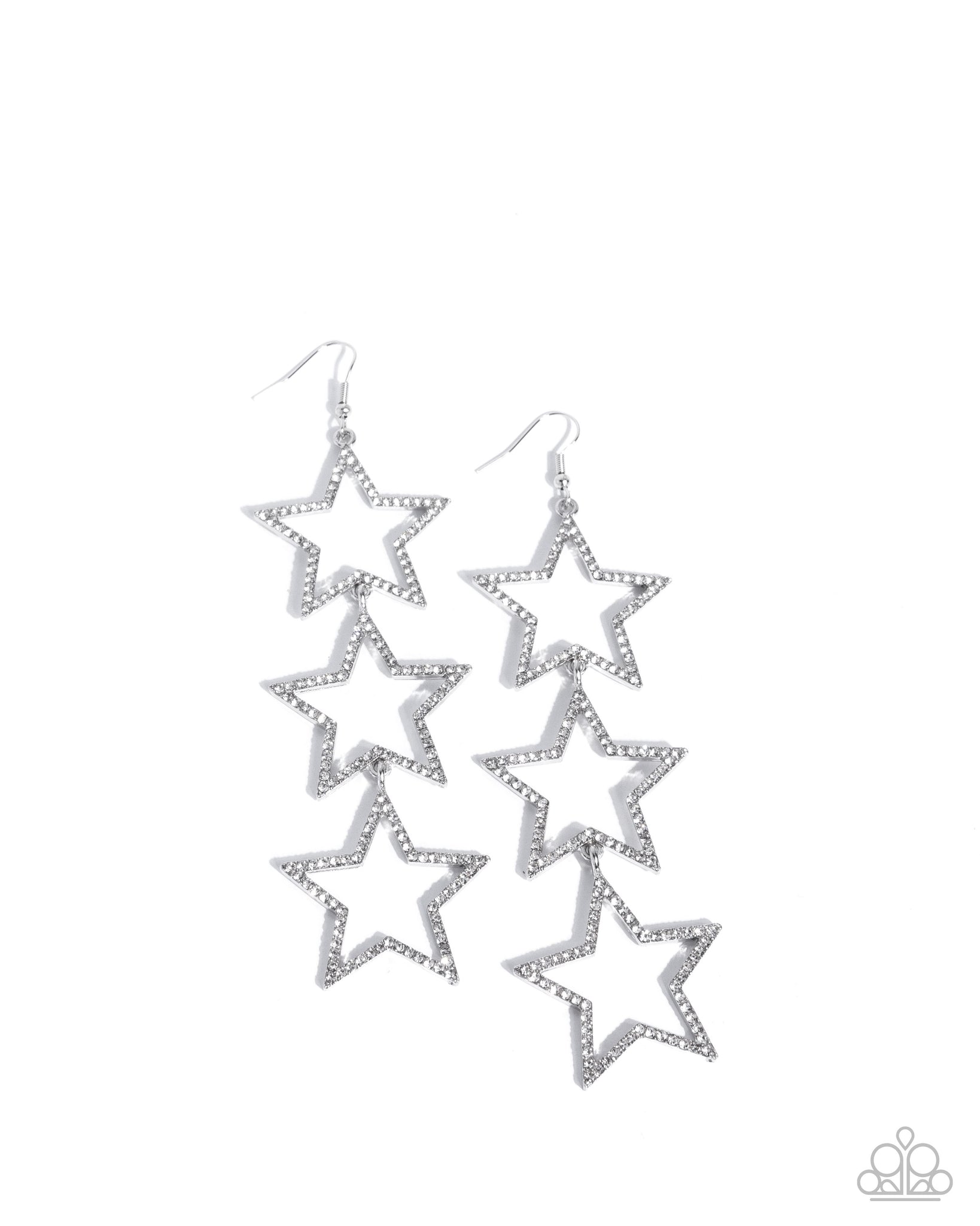 A trio of silver star outlines, encrusted with glittering rhinestones, creates a dazzling display of celestial beauty. Earring attaches to a standard fishhook fitting.